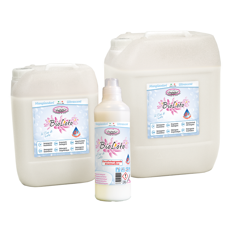 Deodetergente Multi Enzimatico al Fior di Loto per bianchi e colorati. Azione ad ampio spettro contro tutte le macchie.