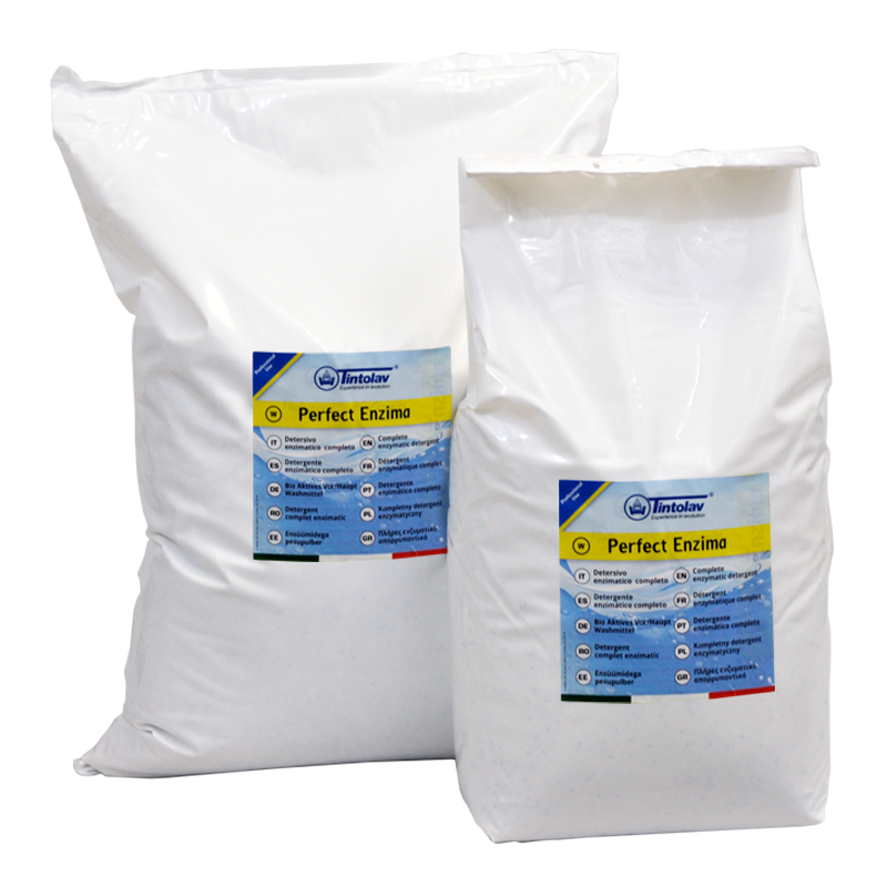 PERFECT ENZIMA è un detergente in polvere enzimatico solo per uso professionale. Contiene enzimi specifici per le macchie proteiche e l’agente sbiancante è attivo da 40°C a 90°C. E’ ideale per tutti i gradi di durezza dell’acqua e si può utilizzare con i colori scuri. L’unione dell’agente sbiancante di ossigeno e degli enzimi rende questo prodotto ideale per i capi particolarmente sporchi. PERFECT ENZIMA è ideale per il lavaggio dei tessuti naturali e sintetici, dei jeans, delle magliette ecc.