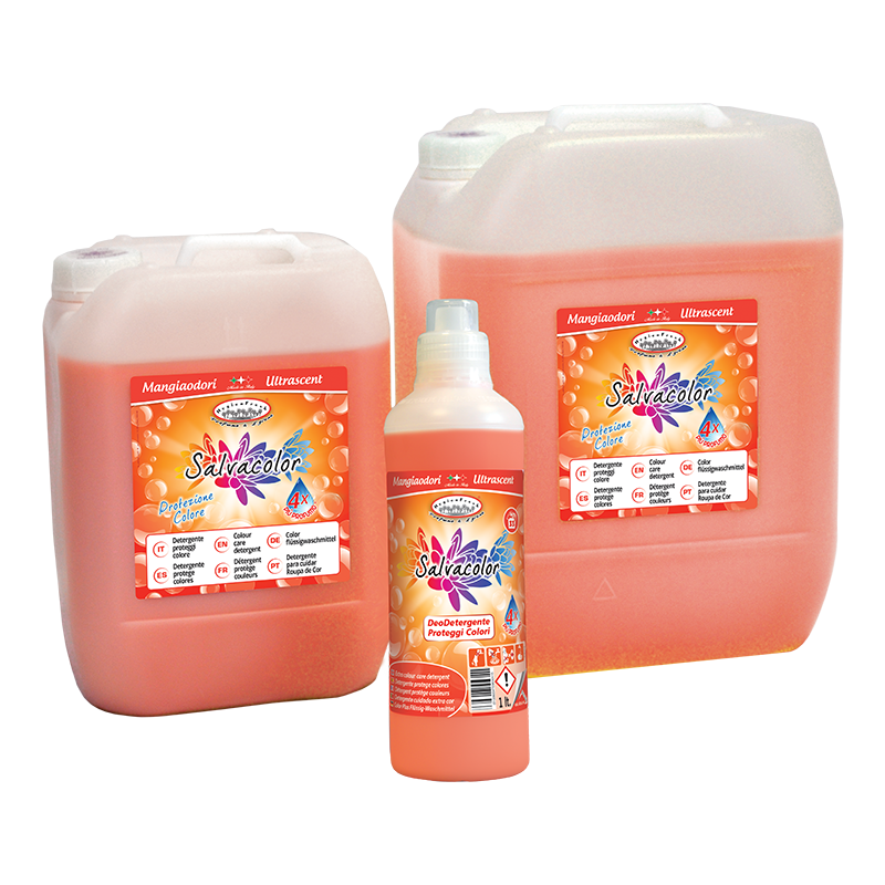 Deodetergente liquido con azione”proteggi-colori” per lavatrici e a mano. Specifico per capi colorati, con additivi antiridepositanti e polimeri salvacolori in grado di evitare il trasferimento delle tinte.