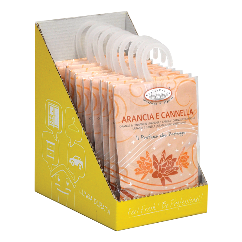 Espositore con 12 buste profumate con gancio alla fragranza Arancia e Cannella. Profumano e proteggono a lungo.